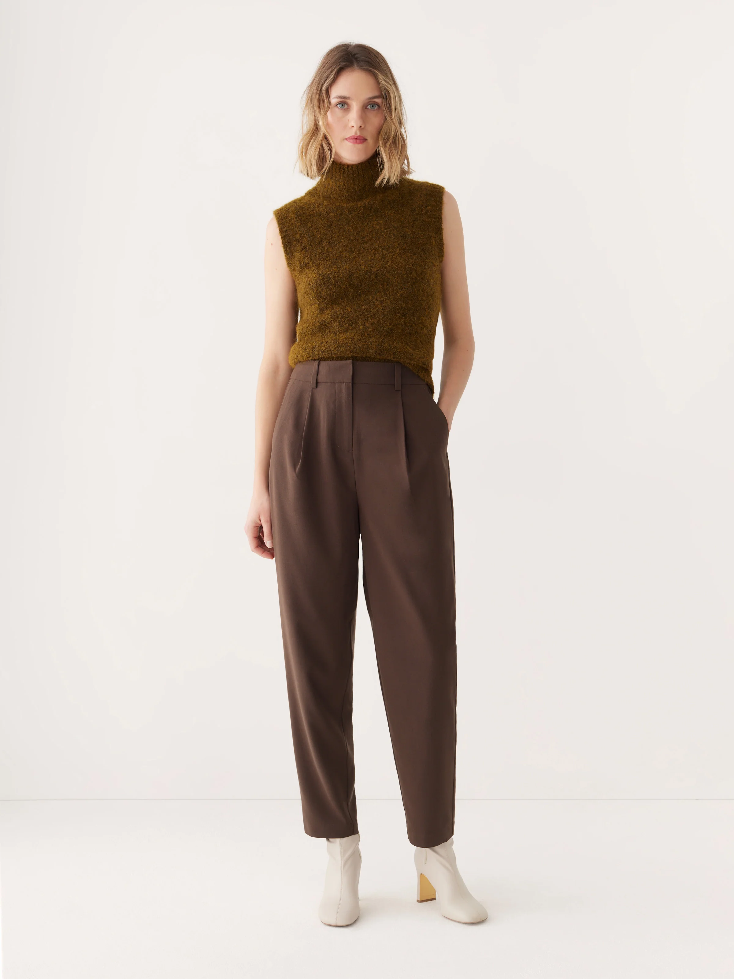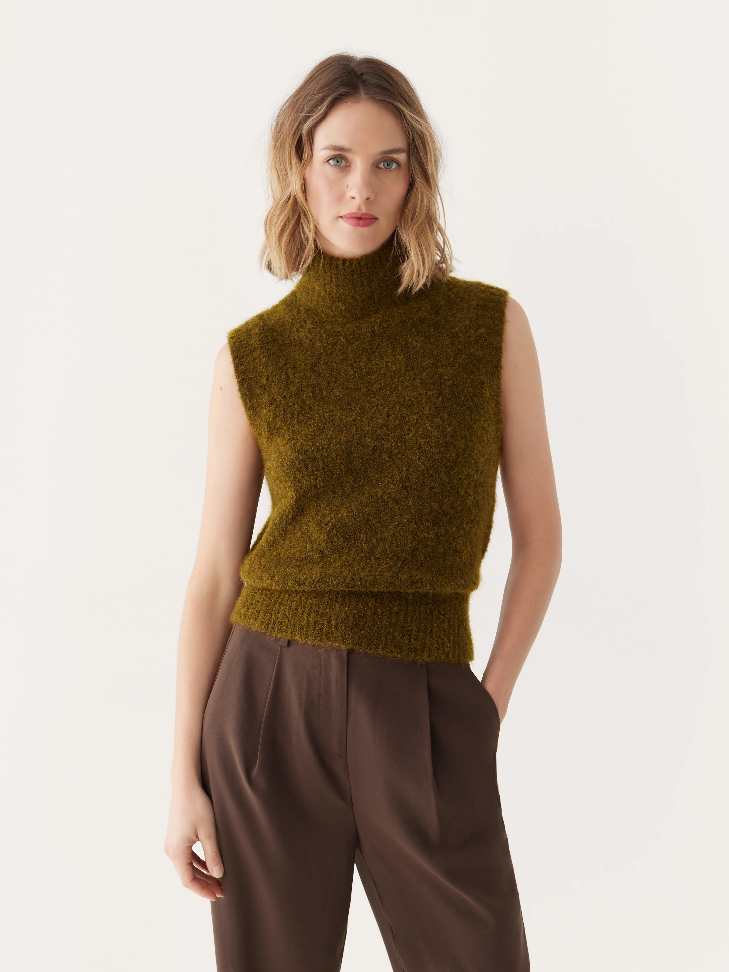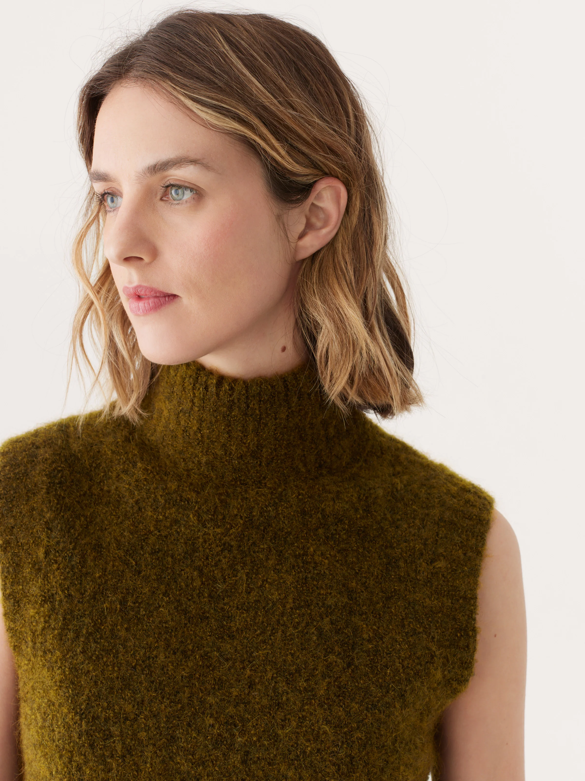 Add refined texture to your wardrobe with this mock-neck sweater vest. Its soft, bouclé knit is made from a blend of cruelty-free wool, recycled nylon, mohair, and spandex for easier moves. Regular fit. Ribbed edging.