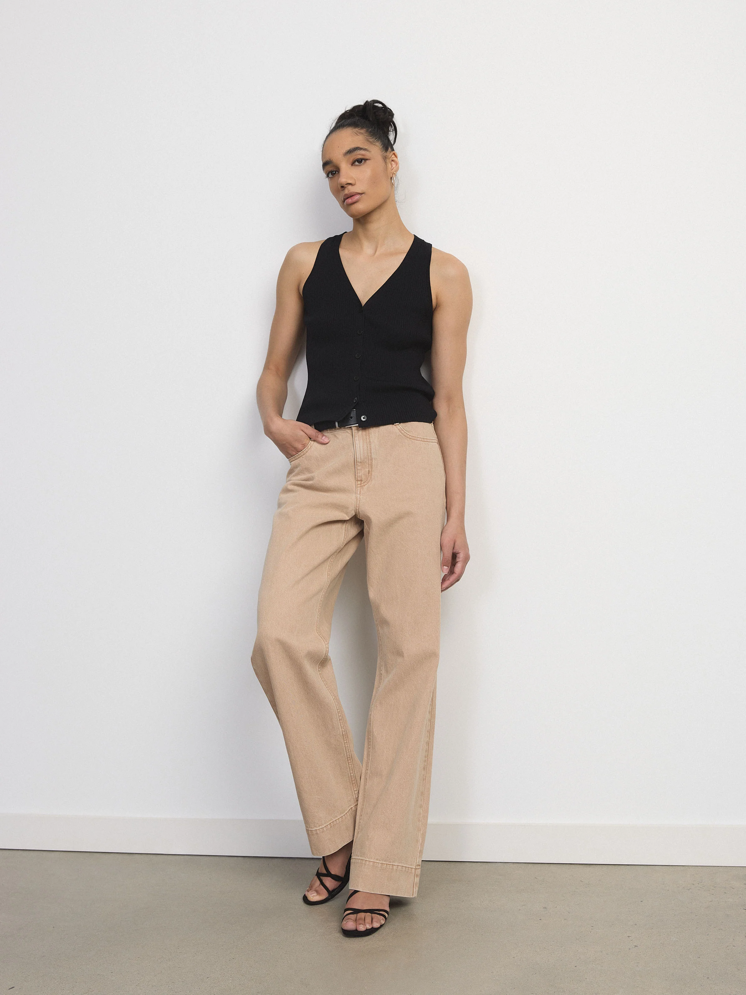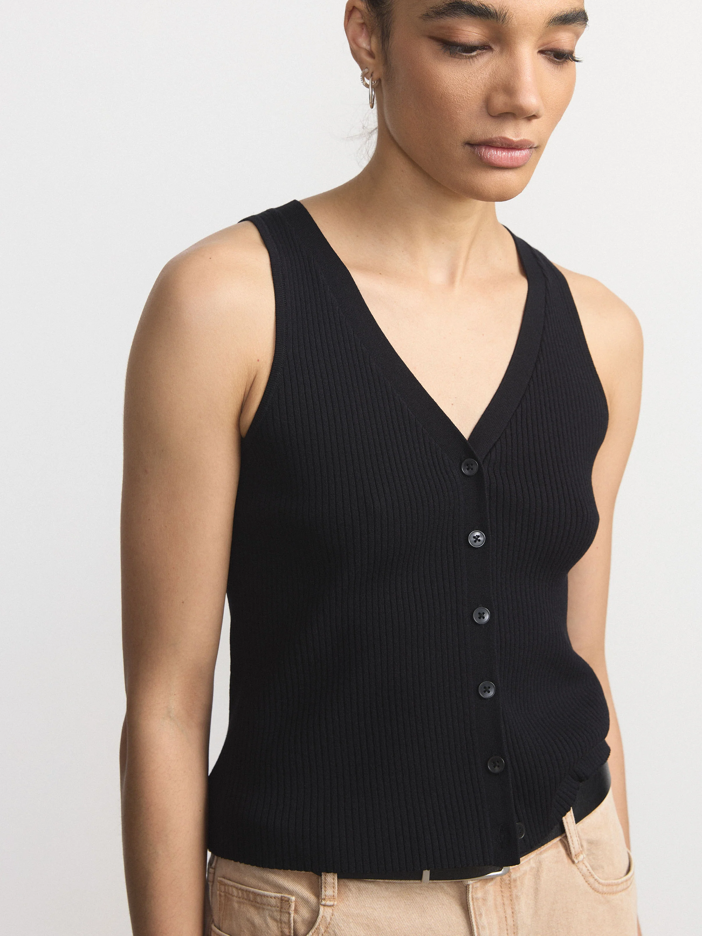 Effortless and perfect for spring. This button-up sweater vest is made of a ribbed knit in a blend of LENZING™ ECOVERO™ viscose and recycled nylon. Features a slick, relaxed fit. V neck with button closure.