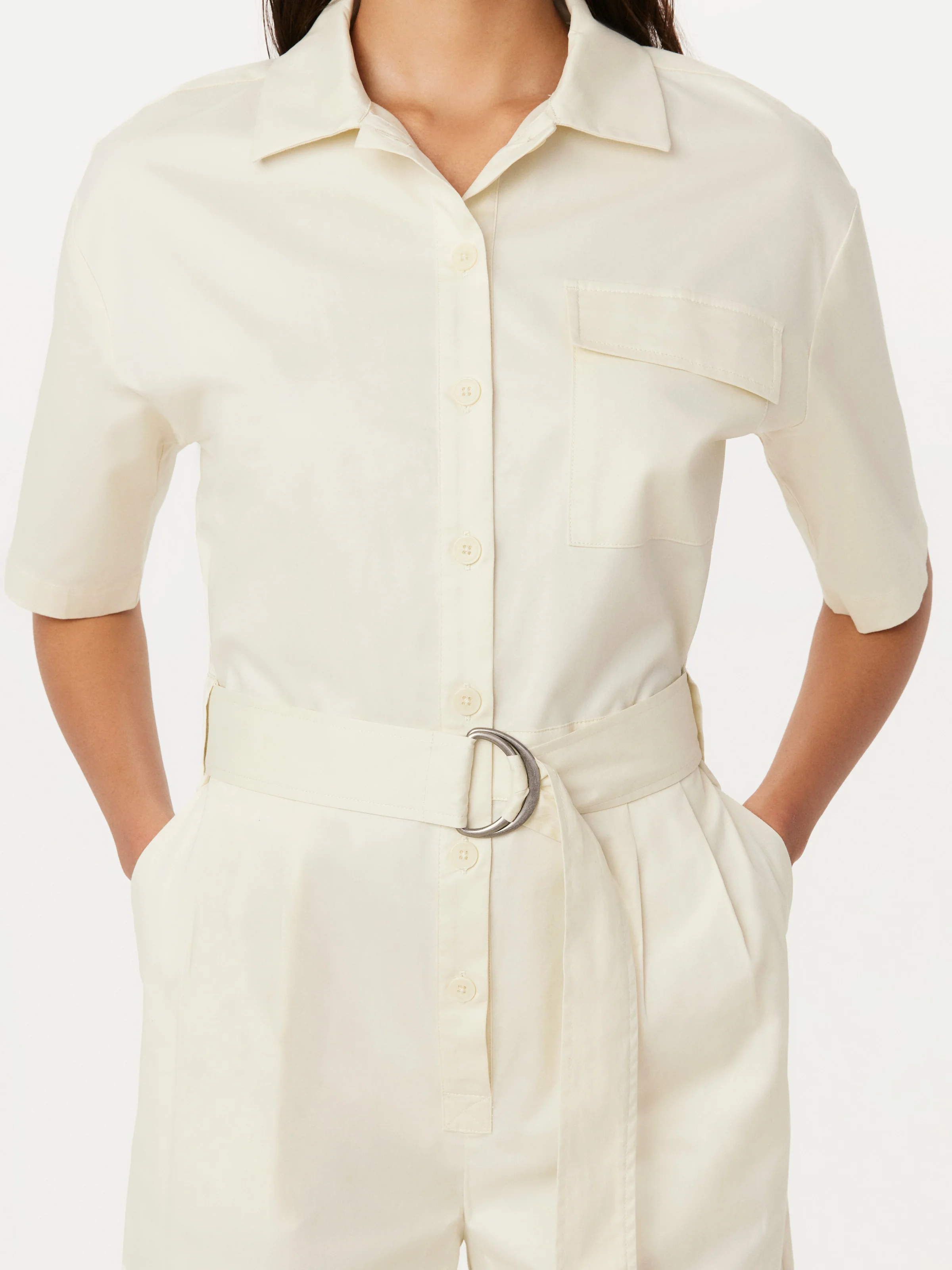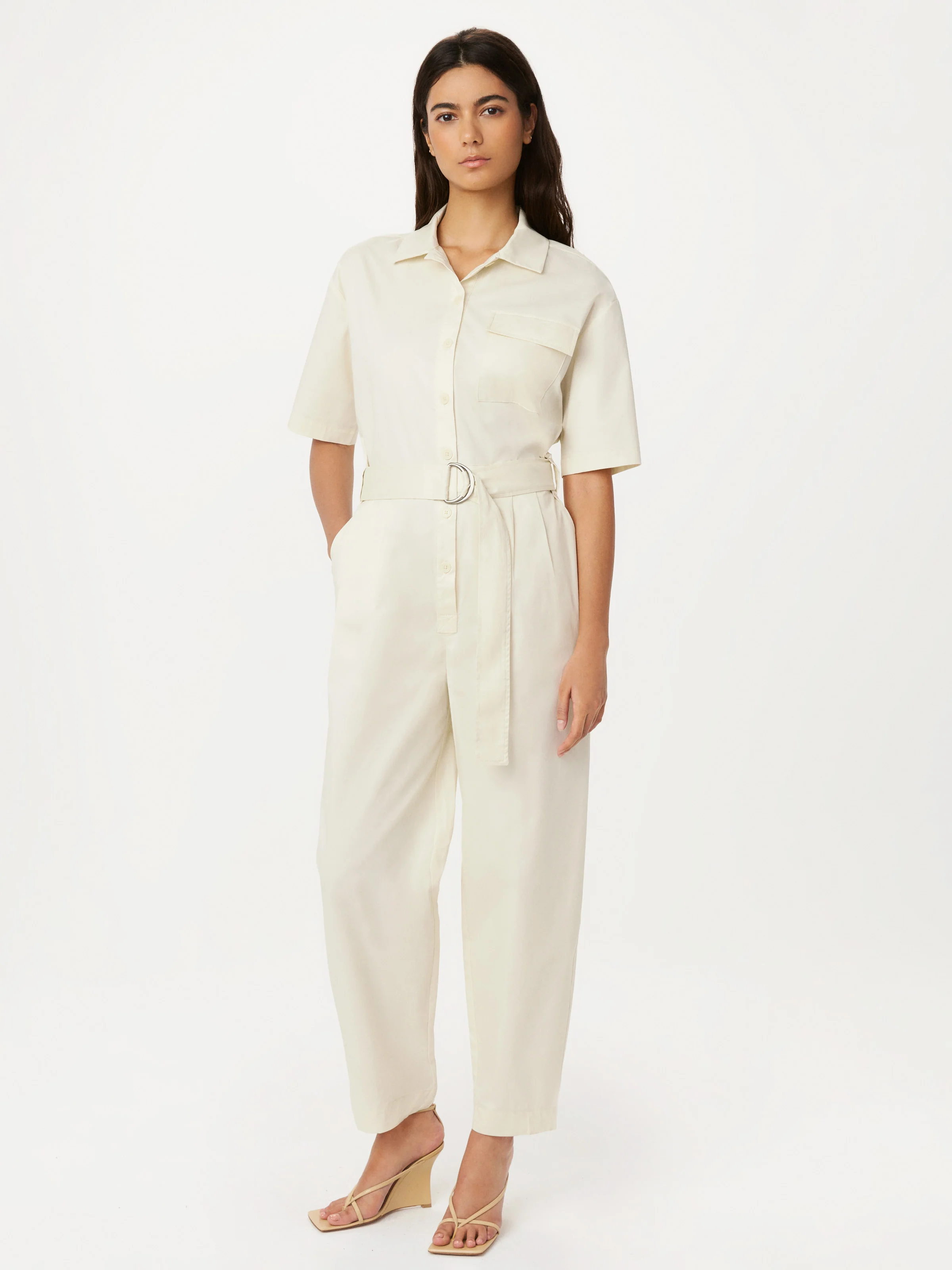 A modern essential. The parachute jumpsuit is made with a crisp, lightweight organic cotton poplin. Relaxed fit. Ankle length leg. Self-belt for a more fitted look. Short sleeves. Slash pockets. One patch pocket with flap at the chest. Point collar. Unlined.